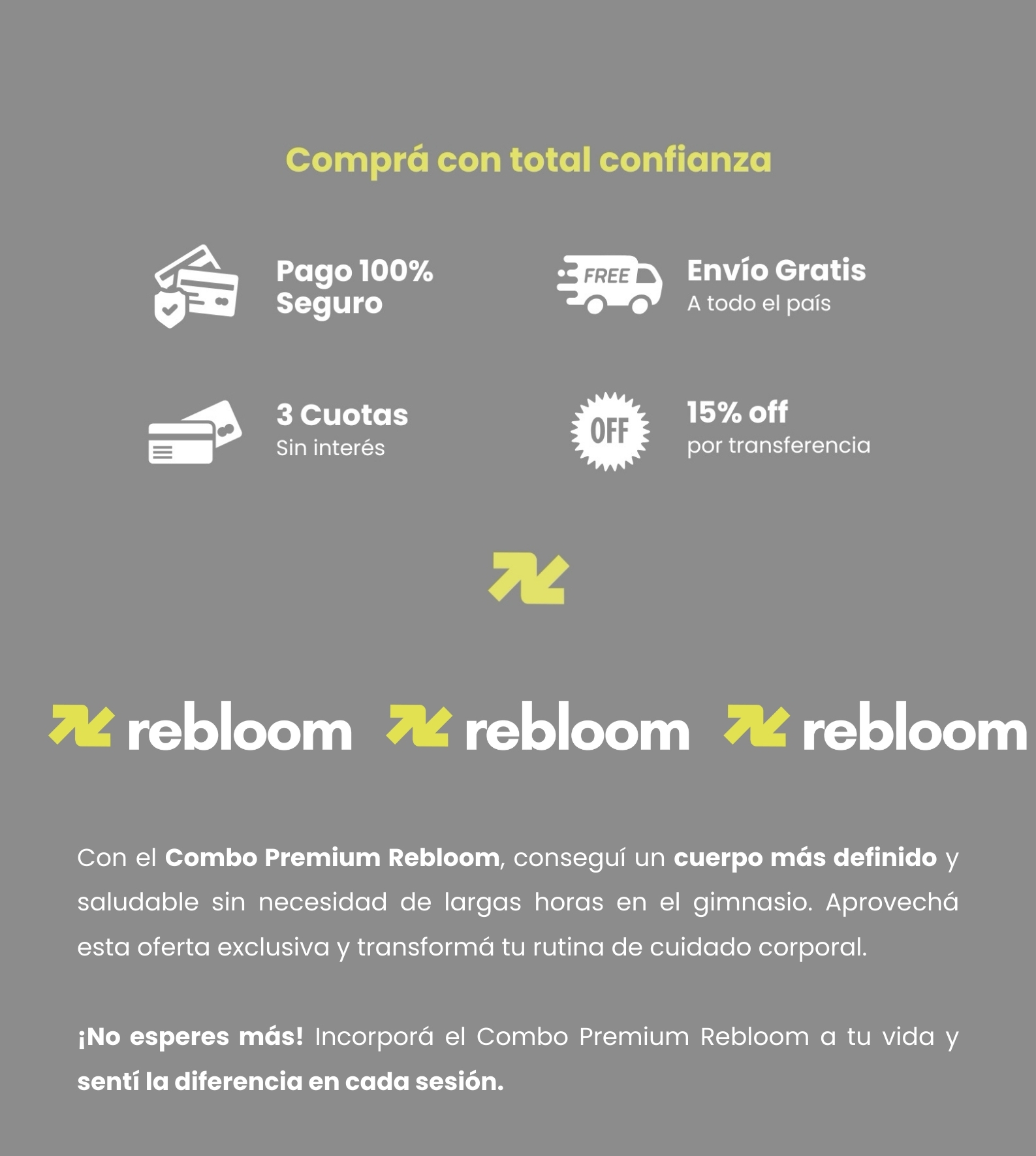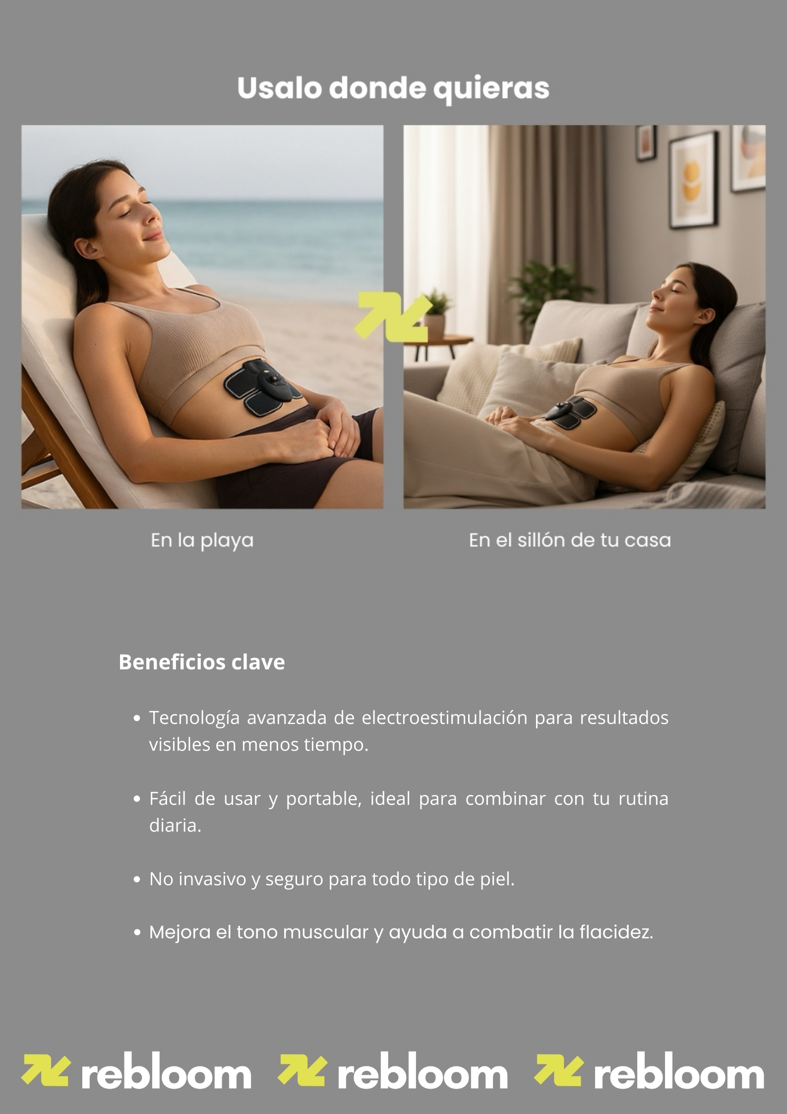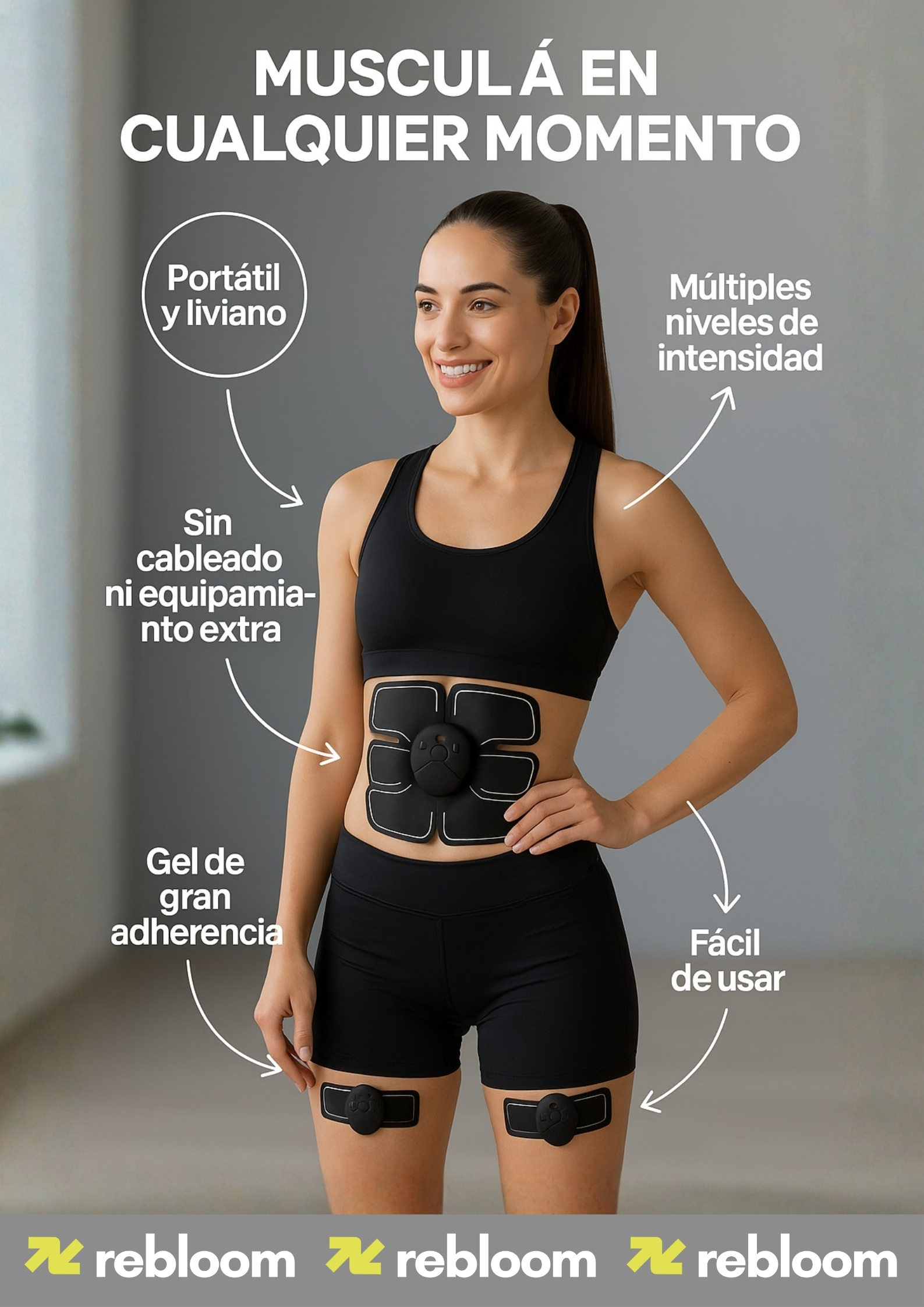 Descubrí el Combo Premium Rebloom, la solución perfecta para tonificar y fortalecer tu cuerpo desde la comodidad de tu hogar. Este set incluye electro estimuladores musculares diseñados específicamente para abdomen, piernas y brazos, ¡y además te regalamos uno para glúteos!